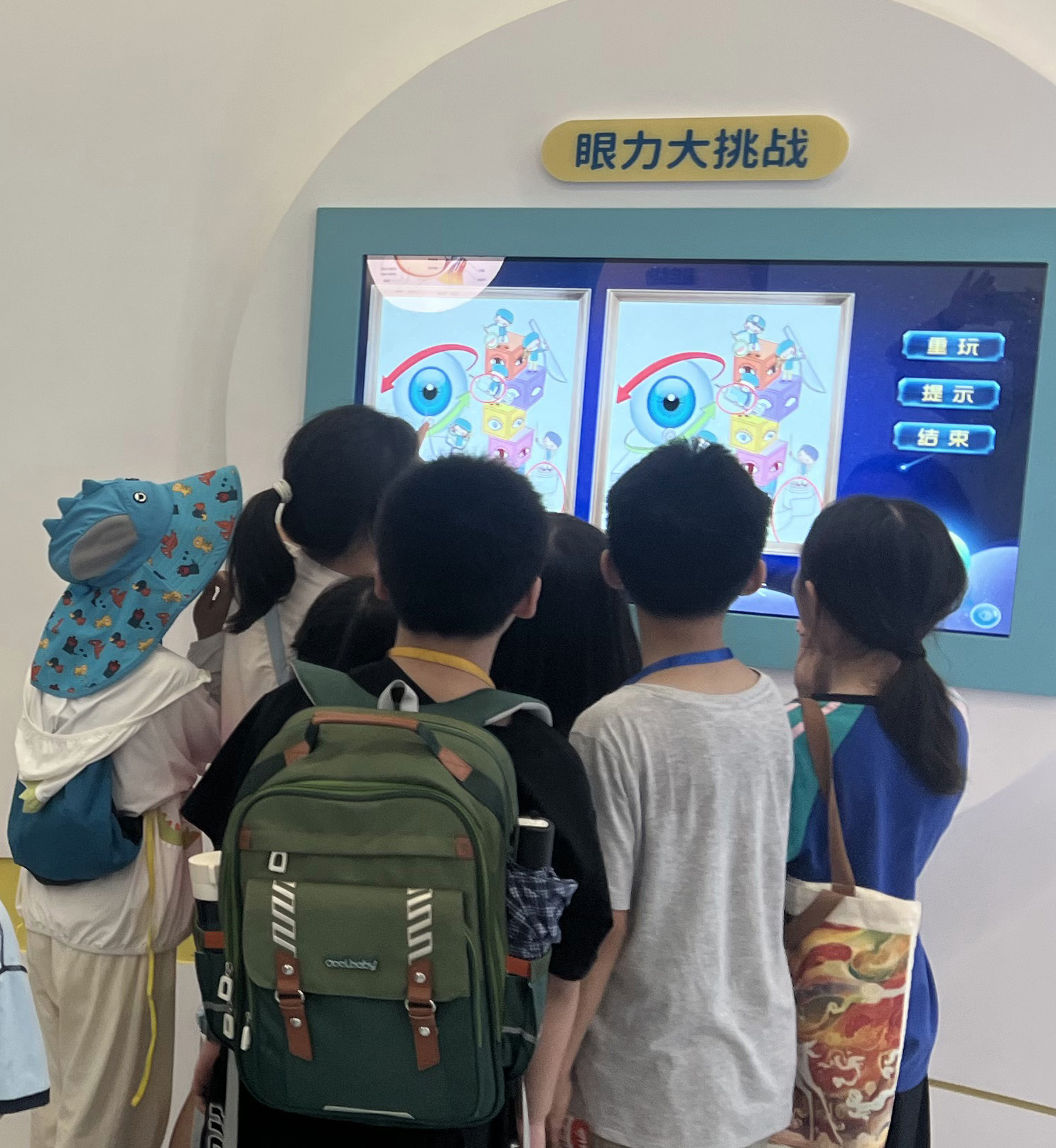 互动体验环节里,科普馆的多媒体设备成了 “科普好帮手”。同学们兴致勃勃地参与眼健康主题互动游戏,轻松强化了对眼球结构、视觉原理及护眼要点的理解,现场学习氛围热烈又活跃。
