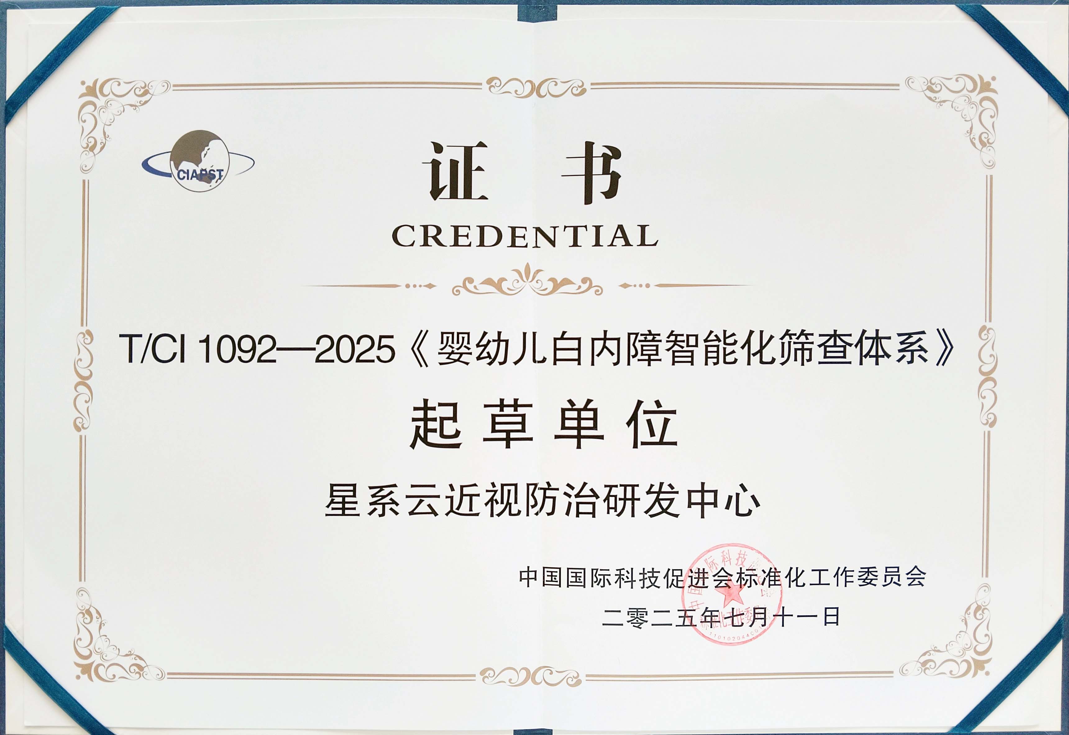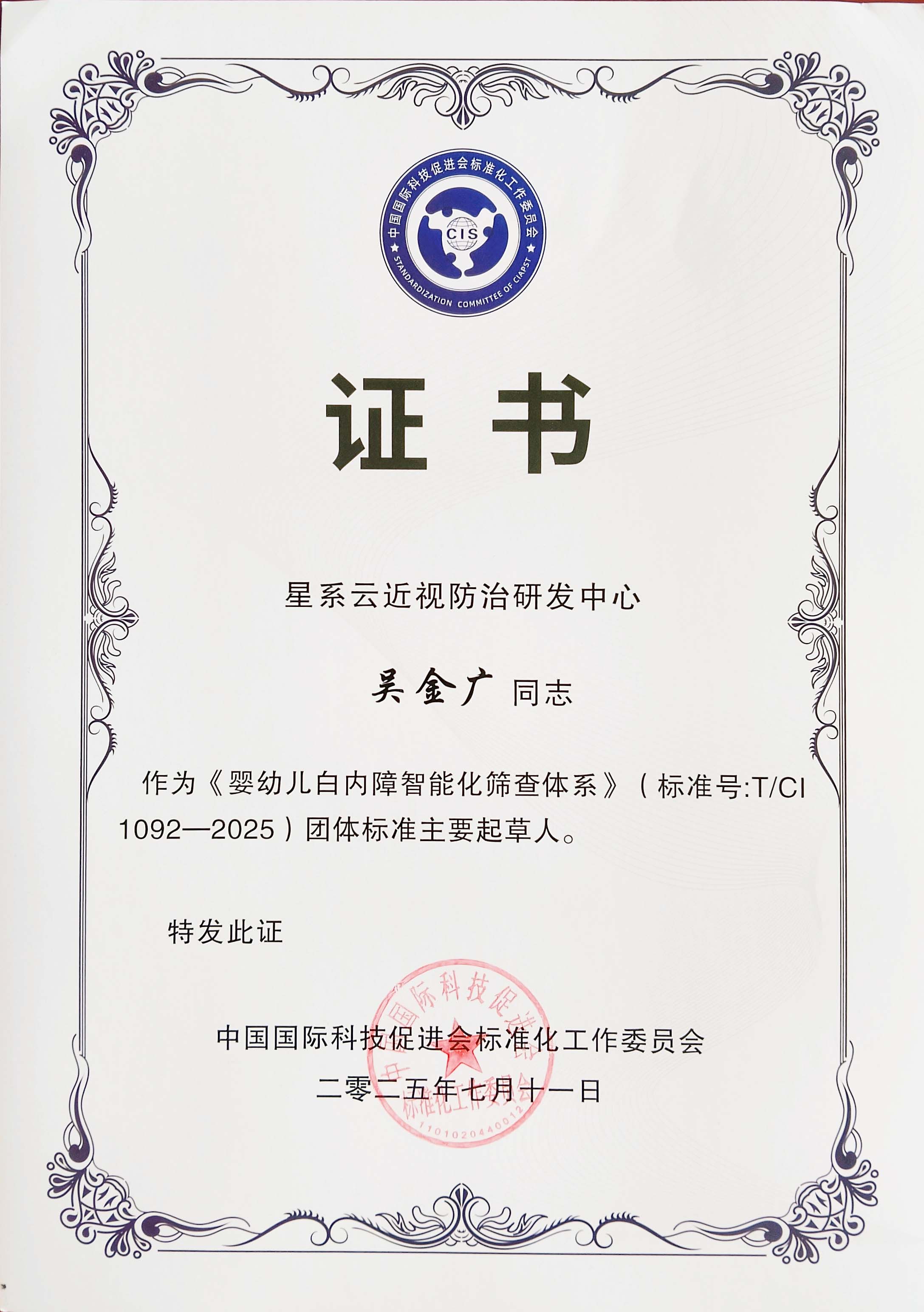 星系云近视防治研发中心喜获中国国际科技促进会标准化工作委员会颁发的《婴幼儿白内障智能化筛查体系》起草单位证书,星系眼视光专科吴金广主任荣获《婴幼儿白内障智能化筛查体系》主要起草人证书。