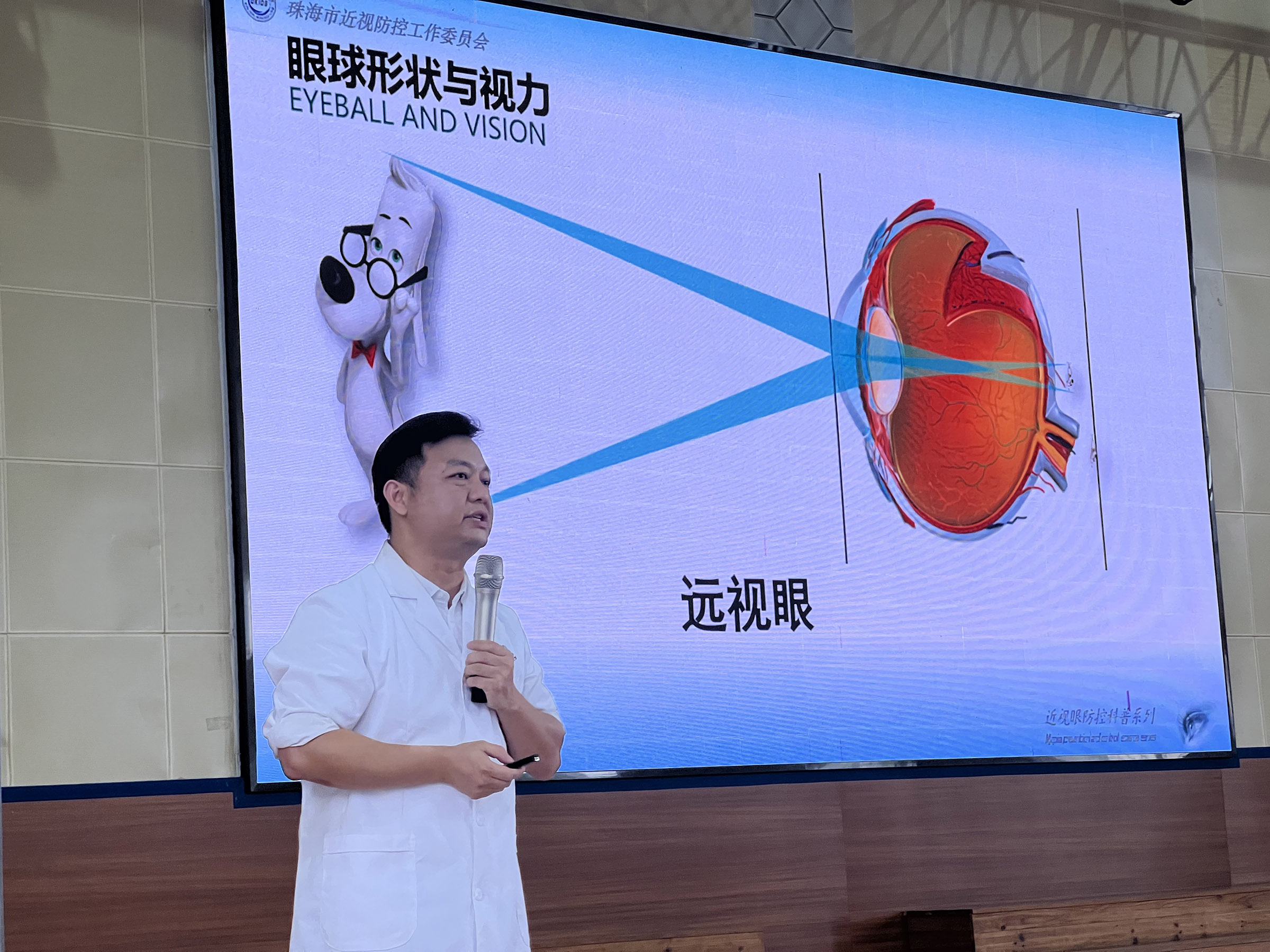 讲座中,刘主任围绕 “近视防控” 核心展开讲解,他先通过一组最新数据介绍儿童近视现状,随后分析近视对孩子学习、生活的直接影响,以及高度近视可能引发的眼底病变等远期危害,让家长和师生重视从小预防近视的必要性。