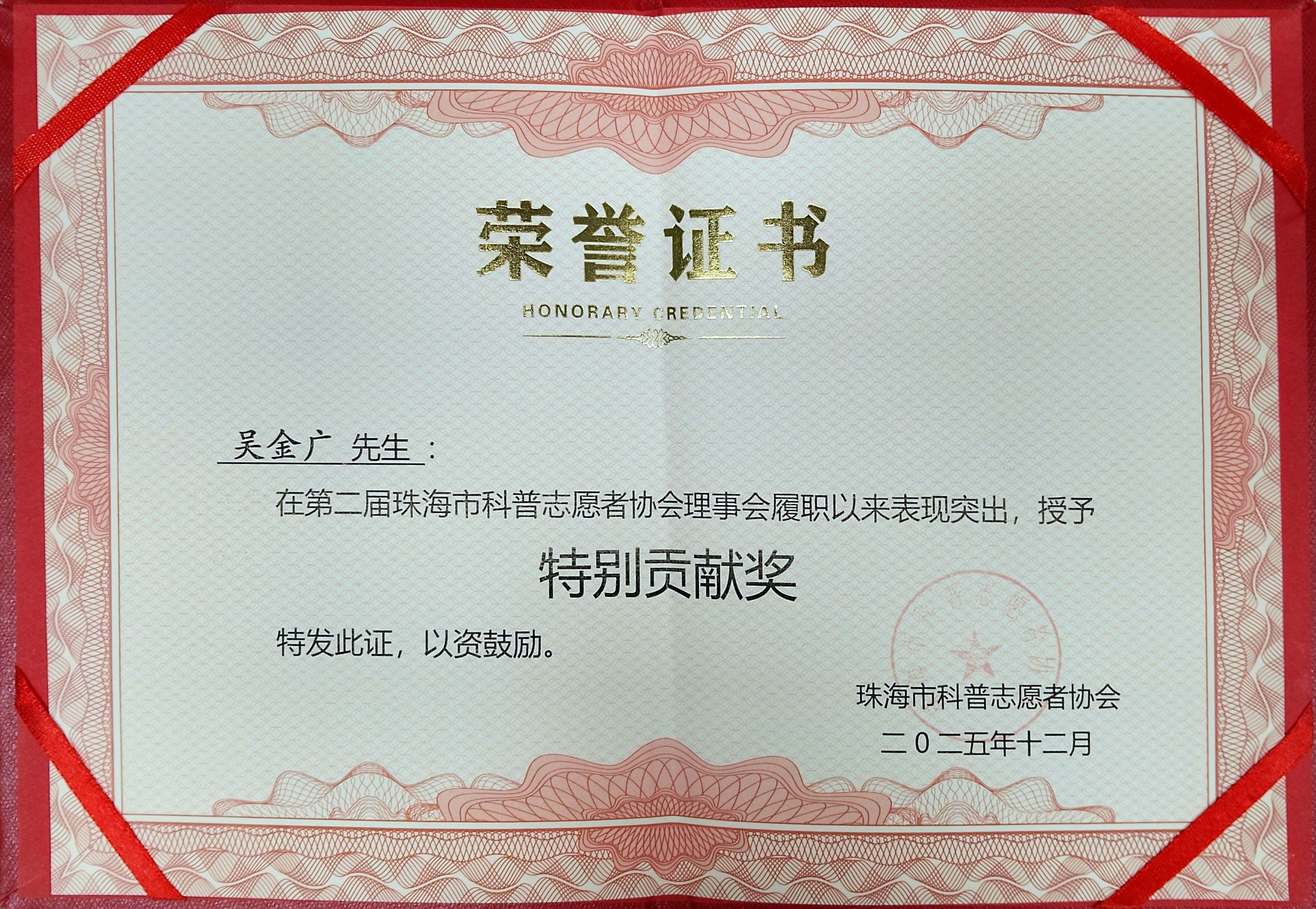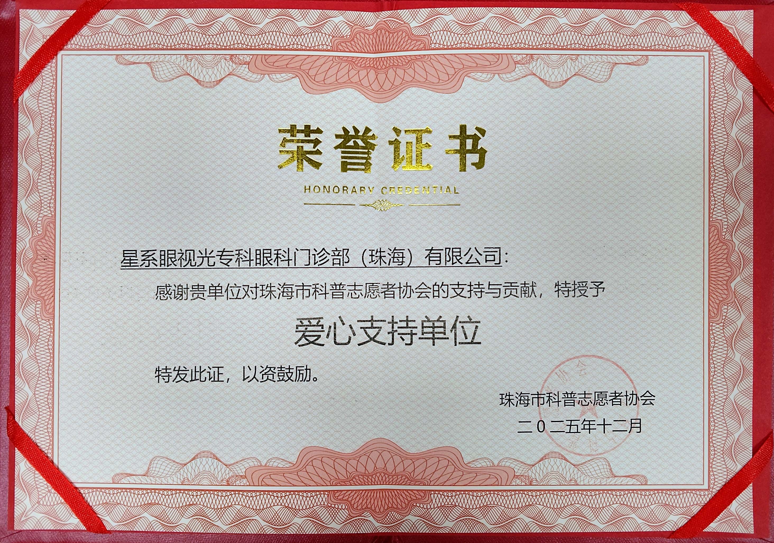 大会还审议通过了《关于表彰珠海市科普志愿者协会优秀理事的决定(草案)》。吴金广主任由于在第二届珠海市科普志愿者协会理事会履职以来表现突出,荣获特别贡献奖。星系眼视光专科眼科门诊部荣获爱心支持奖。
