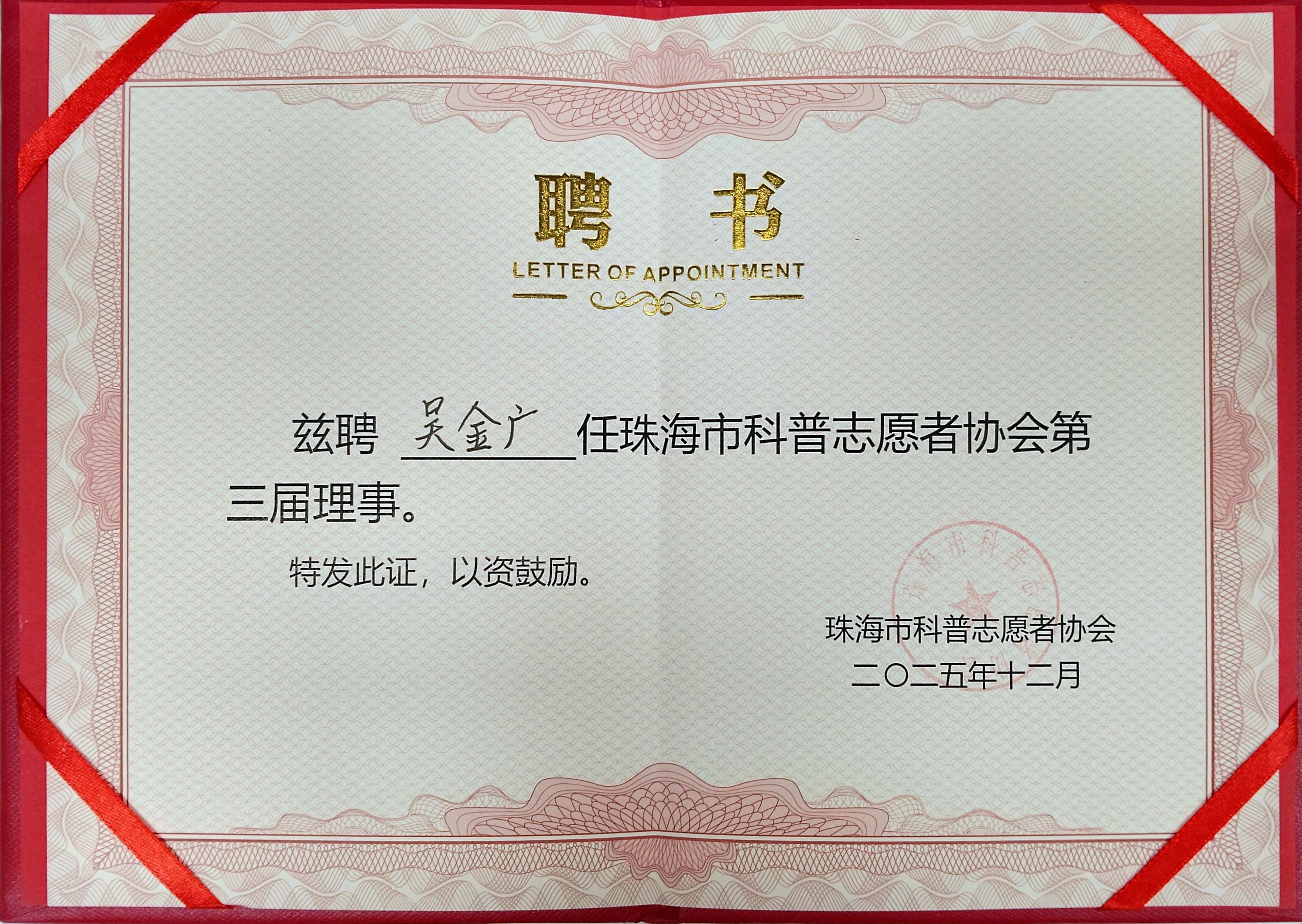 本次大会的顺利召开,标志着珠海市科普志愿者协会将在新一届理事会和监事会的正确带领下步入新征程。在未来的工作中,作为协会理事成员,吴金广主任将于协会成员积极团结协作、充分发挥专业优势,为珠海市的科普志愿者事业做出更大贡献。