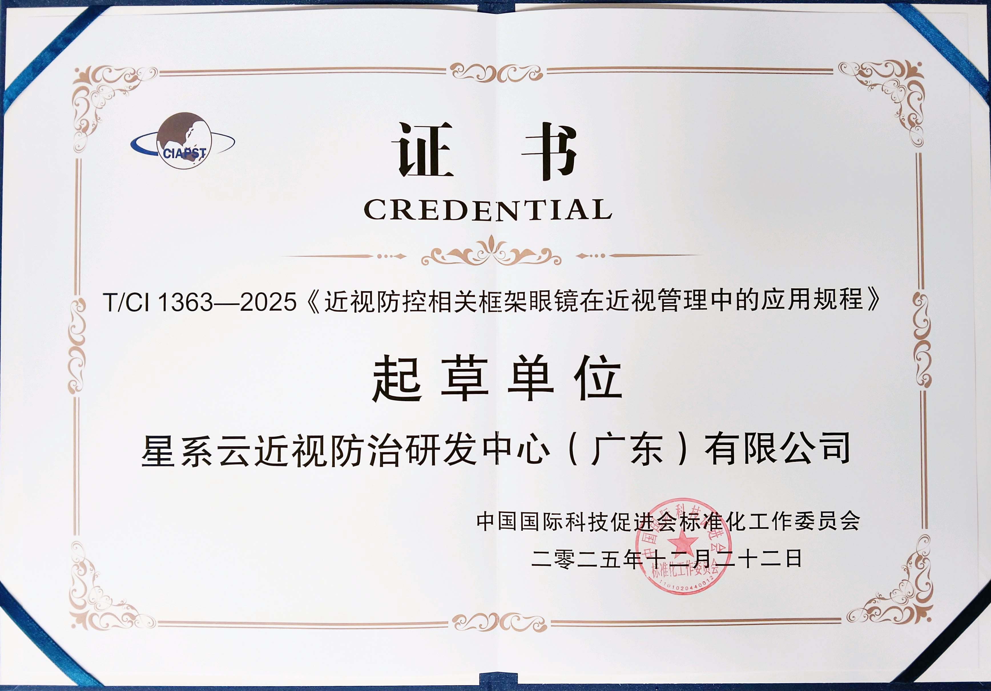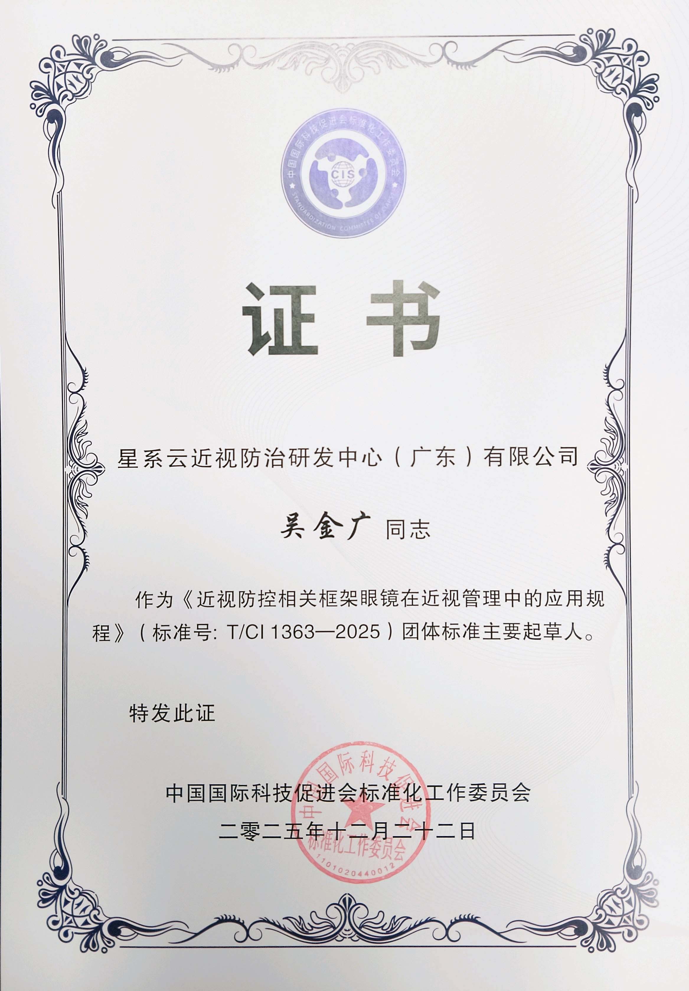 热烈庆祝星系云近视防治研发中心喜获中国国际科技促进会标准化工作委员会颁发的《近视防控相关框架眼镜在近视管理中的应用规程》起草单位证书,吴金广主任荣获《近视防控相关框架眼镜在近视管理中的应用规程》团体标准主要起草人证书。