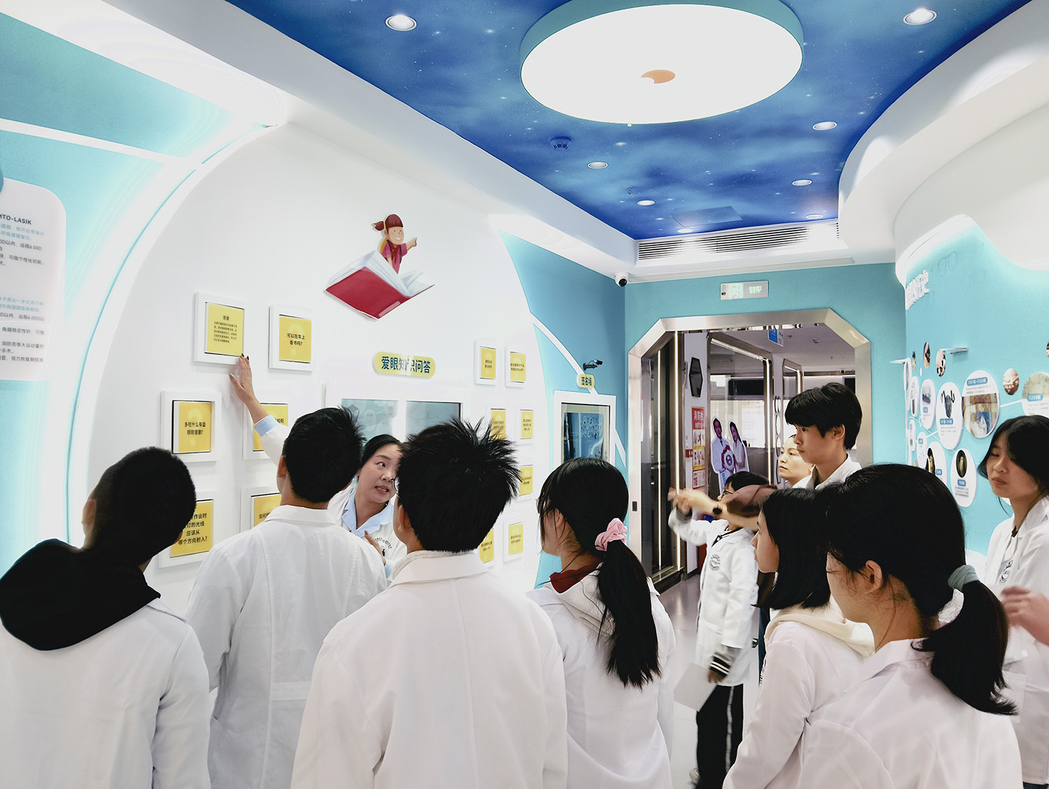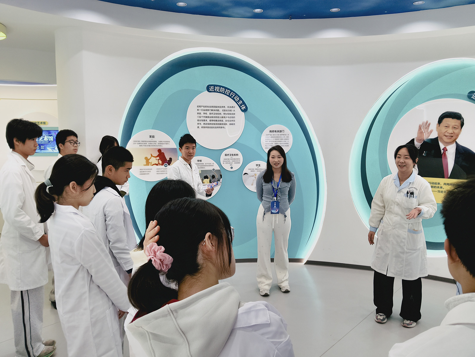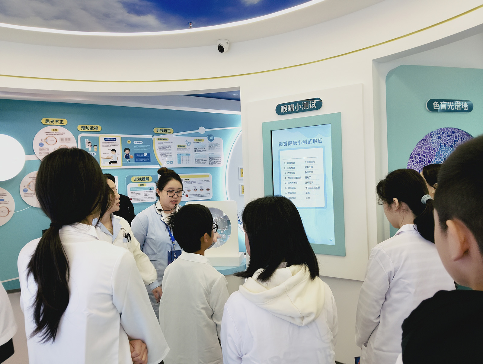 科普馆讲师围绕近视的形成、潜在危害及预防和控制展开详细讲解。同时,从学校、家庭、医疗机构及学生本人多主体协同防控角度,介绍如何科学预防近视。除核心近视防控知识外,科普馆还拓展了常见眼病预防内容,如干眼、白内障、青光眼、老花、散光等眼病,结合各年龄段特点进行讲解,希望孩子们在了解自身眼健康知识的同时也能将所学知识传递给家人。